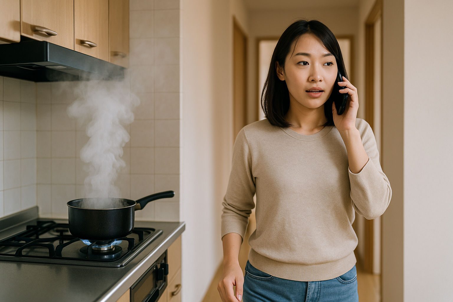 「ちょっとだけだから大丈夫」「すぐ戻るから」——。この「ちょっとだけ」が、キッチンの火災で最も多い原因の一つです。揚げ物の油を熱している最中に電話がかかってきて、ついリビングへ。煮込み料理中に宅配便が来て、玄関へ。こんな経験、誰にでもあるのではないでしょうか。
