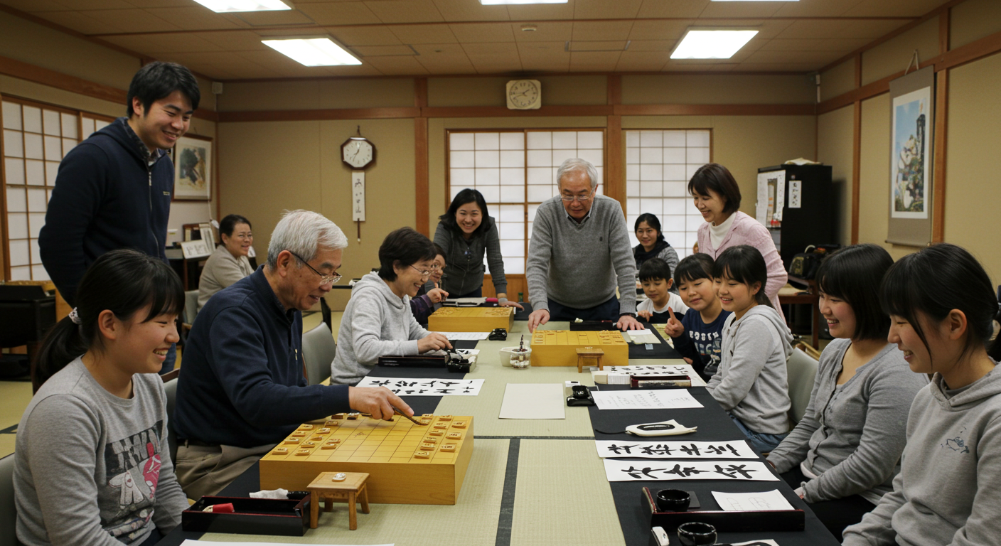 (挿絵:地域の公民館やコミュニティセンターで、高齢者の方が若い世代に将棋や書道などを教えている、多世代が交流している様子のイラスト。活気と温かさが感じられる雰囲気が良い。)