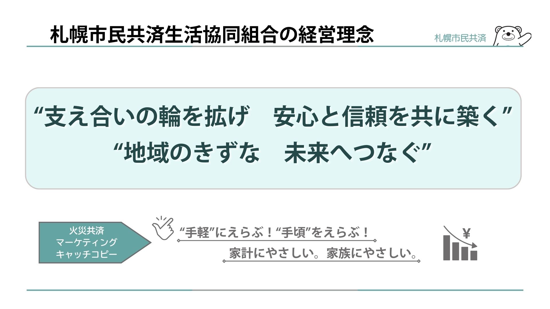 これまでも当組合では、「手頃な掛金で大きな保障」といった組合のスローガン的なキーワードや、過去に策定した中期経営計画においては、「時代を超えて必要とされる市民火災共済を目指して」といった中期経営計画ビジョンを示してきましたが、正式な形での“経営理念”というものはありませんでした。